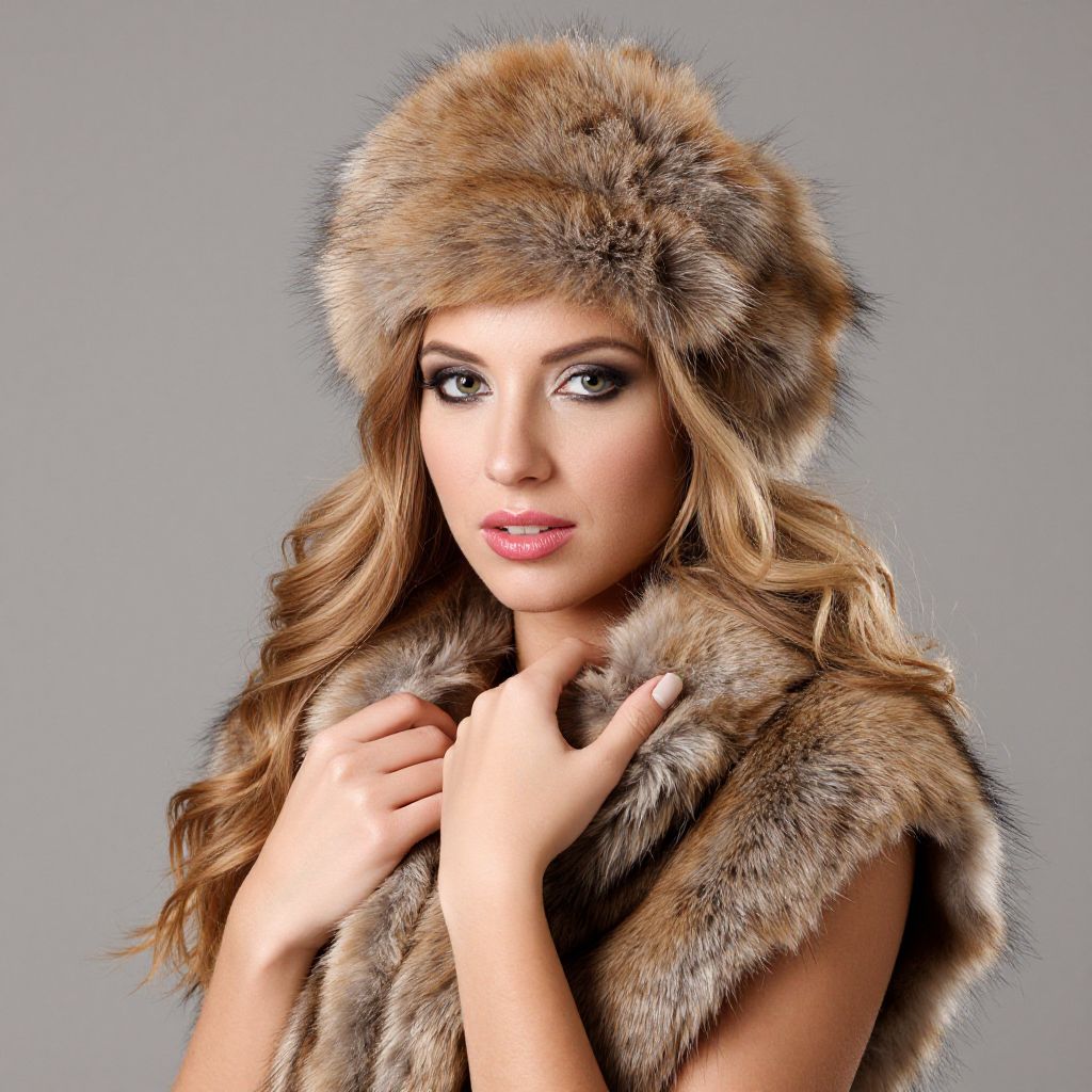 Radiant young woman donning a luxurious brown fur hat and matching fur-lined coat, her golden hair cascading gracefully as she gently touches her collar against a neutral gray backdrop.