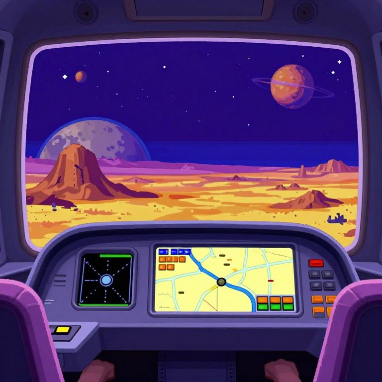 This digital illustration depicts the interior of a spaceship cockpit viewed from the pilot's seat. The cockpit features a large, rectangular window showing a vibrant, otherworldly landscape. The scene outside the window includes a starry, deep blue sky with two large, colorful planets, a smaller moon, and distant, rocky mountains. The ground is a bright, orange desert with scattered rocks. The cockpit's control panel displays a map with a blue route highlighted, and several colorful buttons and screens are visible. The pilot's seat is gray with purple accents, and their hands rest on the control panel. The overall style is colorful and futuristic, with a strong emphasis on bright, contrasting hues.
