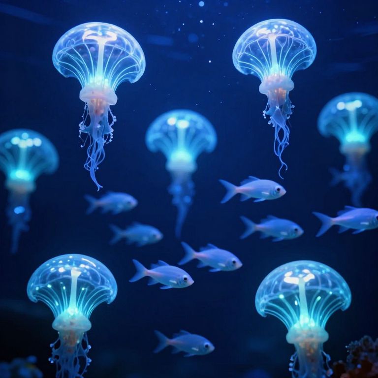 A mesmerizing digital artwork depicts a serene underwater scene where bioluminescent domes float like a celestial sky above schools of translucent fish, their harmonious presence illuminated by ethereal, high-definition light effects.