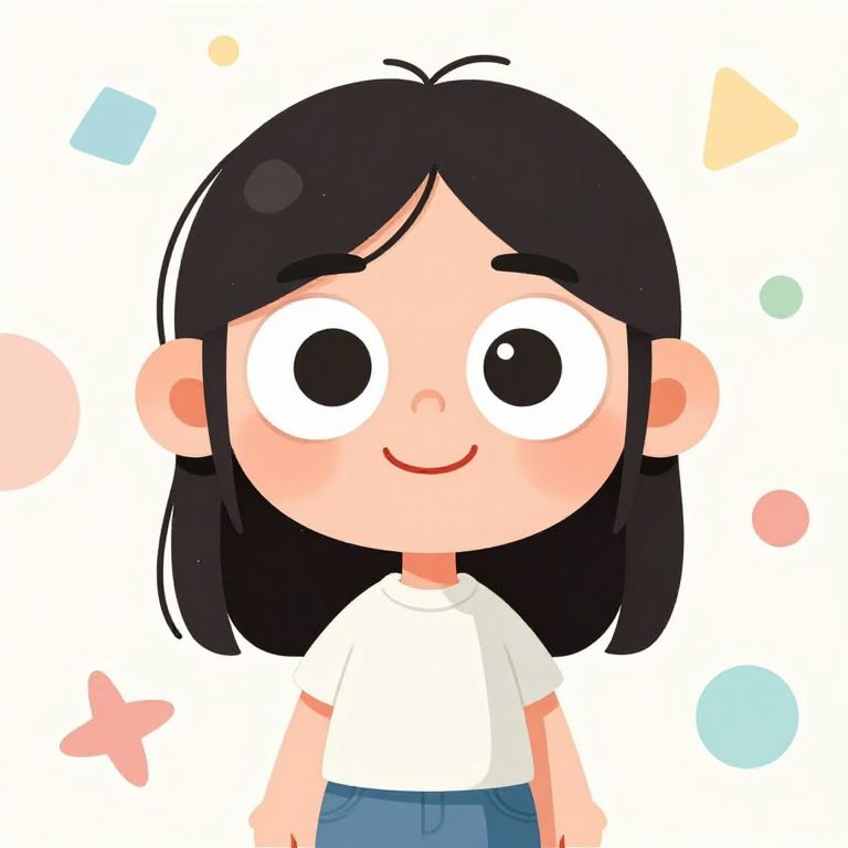 Digital cartoon drawing of a young girl with large, expressive black eyes, a small smile, and black shoulder-length hair. She has light skin and wears a white short-sleeved shirt with blue pants. The background is white with colorful, scattered shapes including pastel-colored circles, triangles, and squares. The style is cute and childlike, with simple, bold lines and vibrant colors. The girl's expression is friendly and approachable.