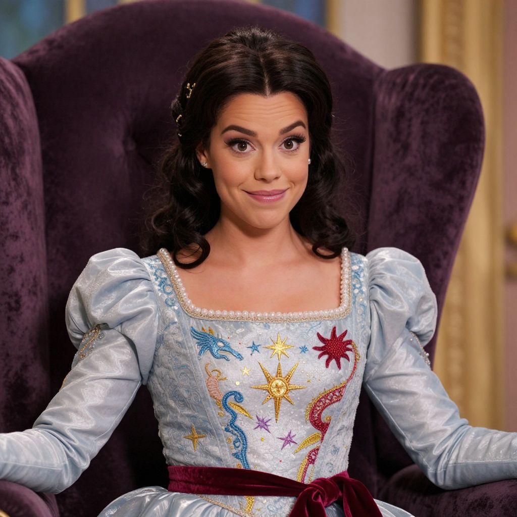 Photograph of a smiling woman with dark hair, wearing a light blue, star-embroidered princess dress, seated in a dark velvet armchair