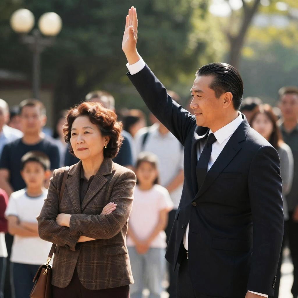 Photograph of a news studio. A woman in a black coat and blue gloves hugs a young boy in a blue shirt. A man in a gray checkered suit and glasses hugs the boy from behind. Two other adults stand in the background. Green lamps on desks. Neutral expressions. Office setting.