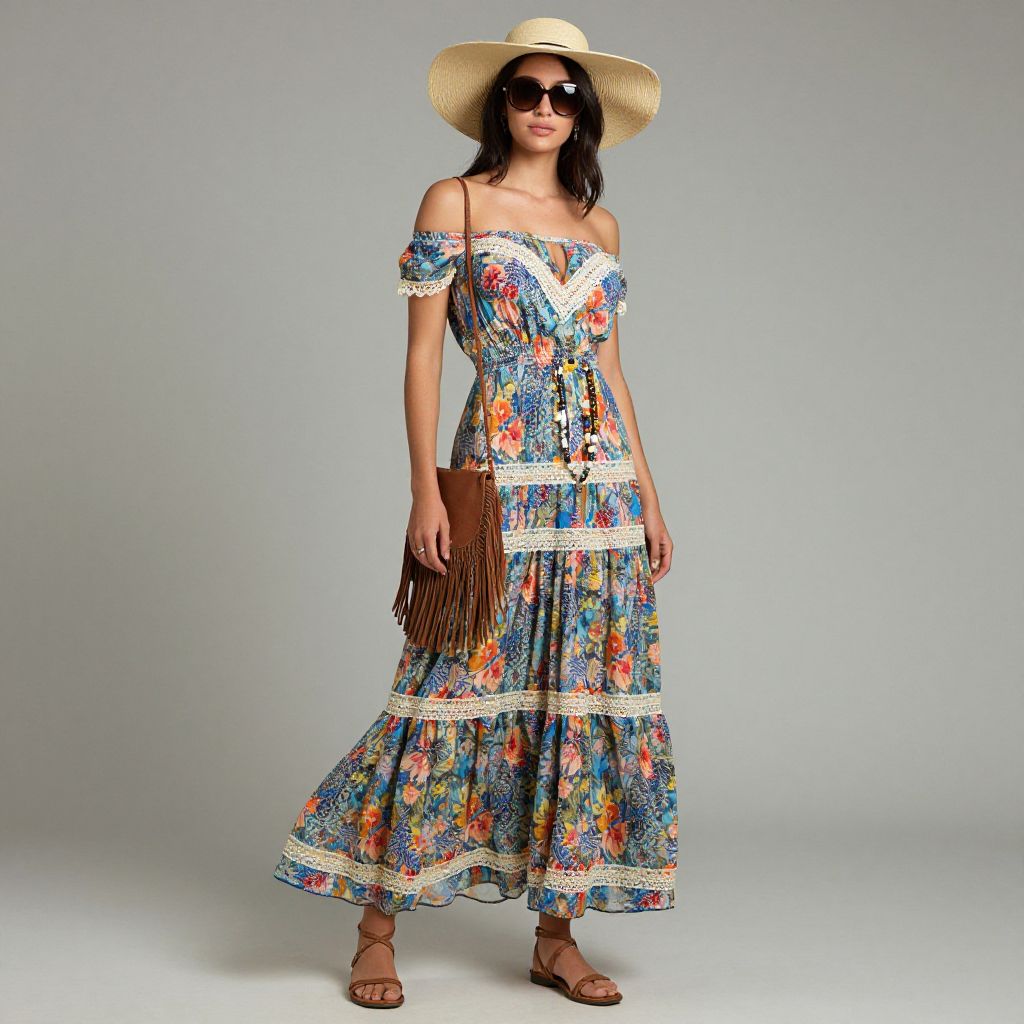Full body shot, lean woman, flowing bohemian maxi dress, vibrant floral patterns, lightweight cotton fabric, off-the-shoulder neckline, delicate lace trim, cinched waist, layered ruffles, ankle-length hem, paired with a fringed leather crossbody bag, earthy tones, adjustable strap, adorned with beads, wide-brimmed straw hat, natural fibers, oversized sunglasses, strappy leather sandals, flat soles, minimal jewelry, boho-chic vibe Sexy. Pretty face and beаutiful eyes. Big breasts