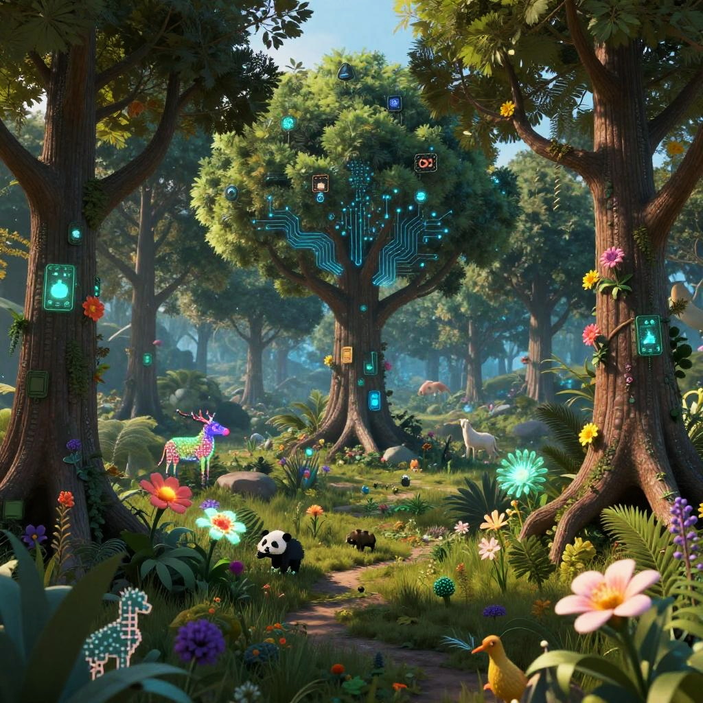 AI generated pictures illustrating a surreal nature scene, where lush forests merge with circuit board patterns, bioluminescent plants glowing softly, and digital animals roam, symbolizing the harmony between technology and the environment.
