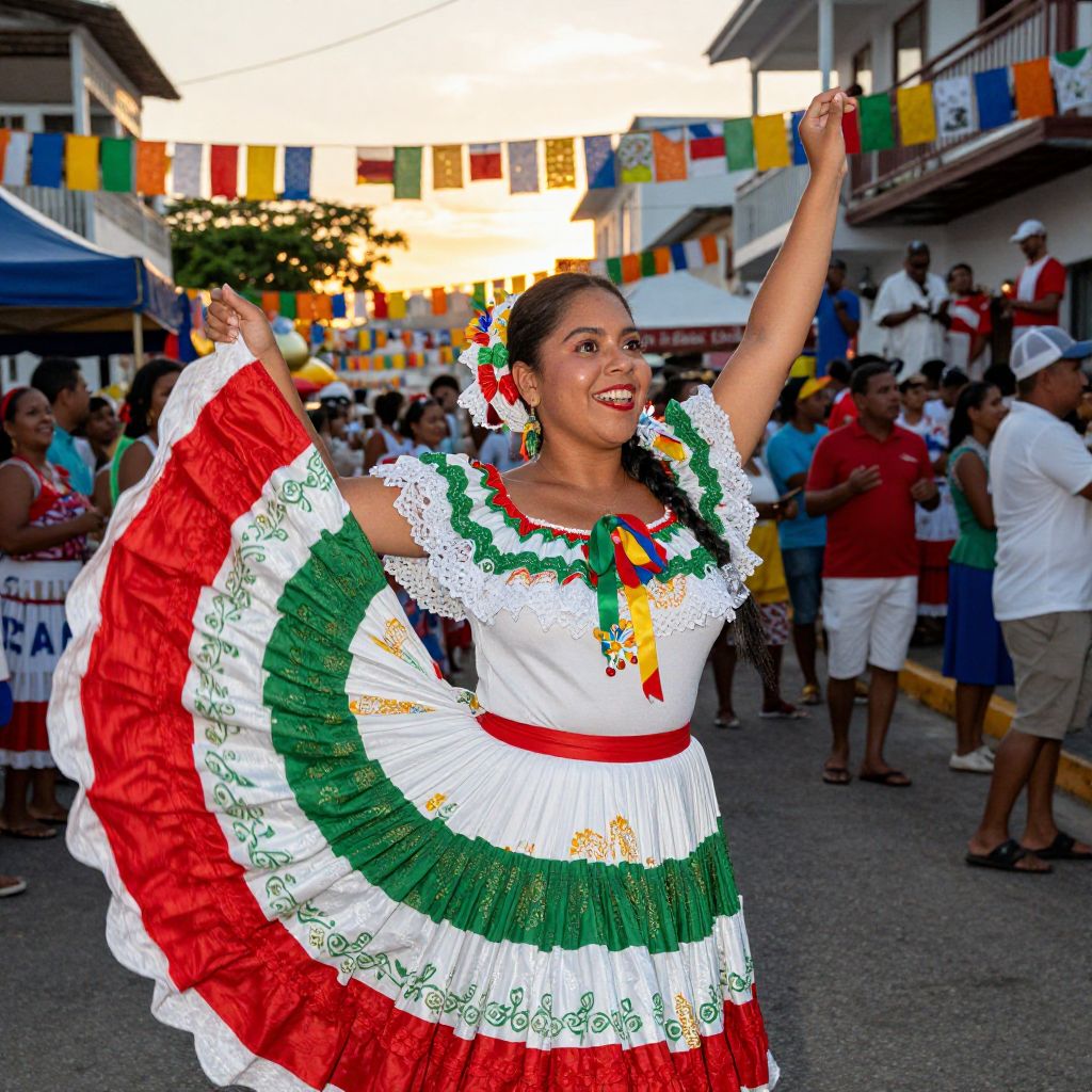 Photograph of a joyful Latina woman with medium brown skin and long black hair, wearing a traditional Mexican dress with white, green, and red stripes, lace details, and colorful embroidery. She raises her arms, smiling widely, with a red ribbon in her hair. The background shows a lively street festival with colorful flags, people in casual attire, and buildings. The sun sets in the distance, casting a warm glow. The scene is vibrant and festive, capturing a moment of cultural celebration.
