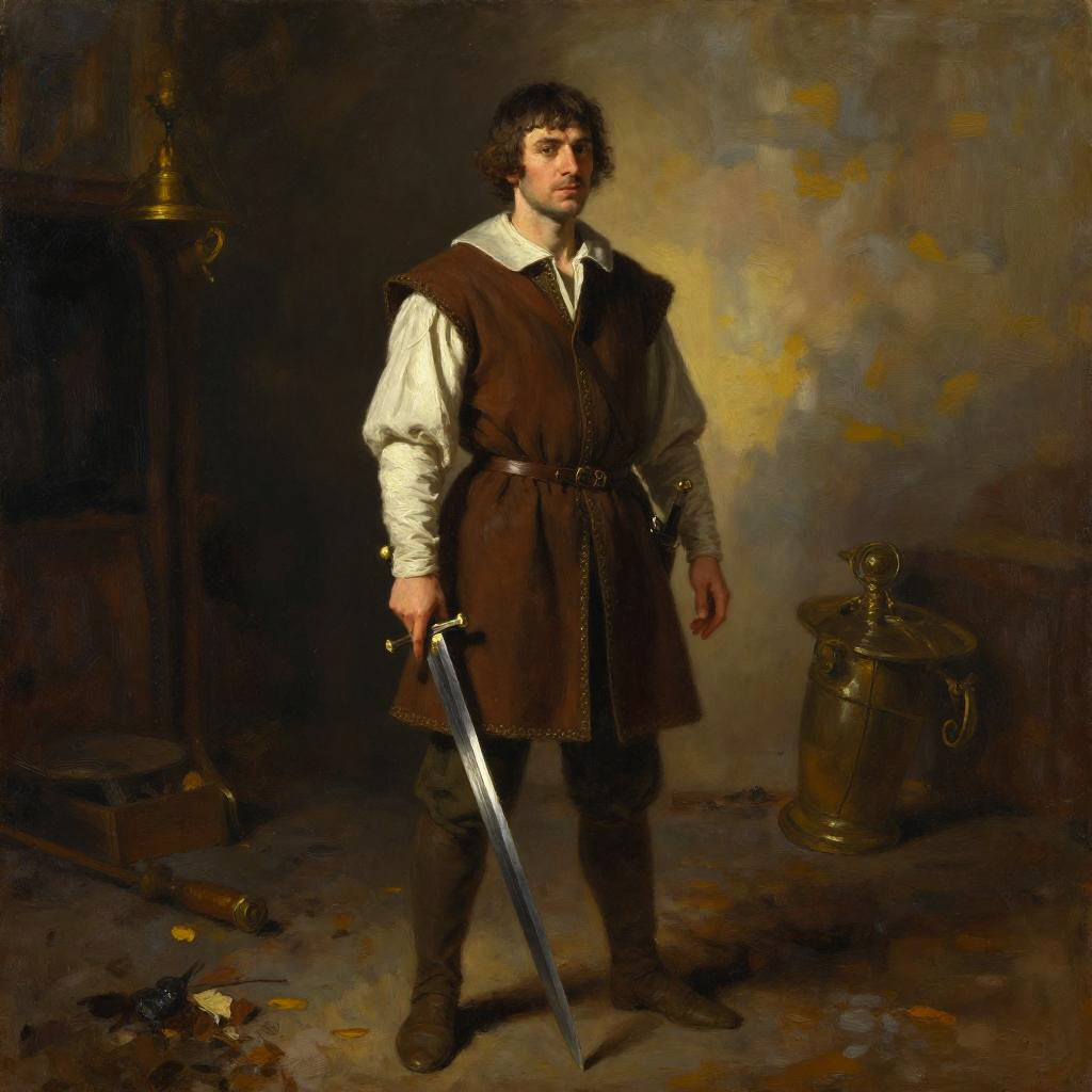 Humorous, man in medieval costume standing in a street with a sword --sref 1405