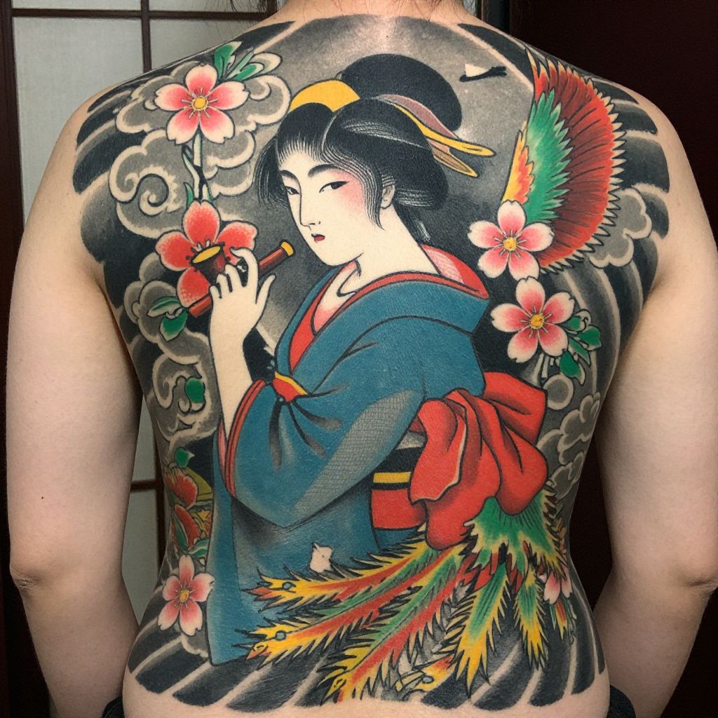 A vivid, full-back tattoo of a traditional Japanese woman with black hair in an updo, wearing a blue and red kimono. She holds a pipe and gazes forward with a serene expression. Surrounding her are colorful, swirling clouds, pink flowers, and a green, red, and yellow phoenix. The tattoo features bold lines and vibrant colors, showcasing a mix of realistic and stylized elements.