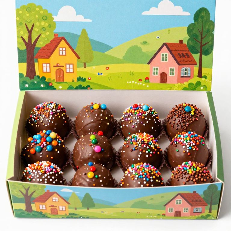 Colorful chocolate truffles topped with festive sprinkles and colorful beads are neatly arranged inside a vibrant Village-themed gift box featuring charming illustrations of houses, trees, and a sunny landscape.