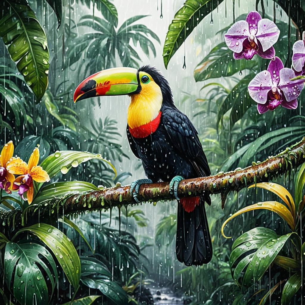 Digital illustration of a sleek black panther standing on dense undergrowth in a tropical jungle. The scene features thick vines, lush green foliage, dappled sunlight filtering through the canopy, and glowing eyes in the background creating an atmospheric and mysterious mood.