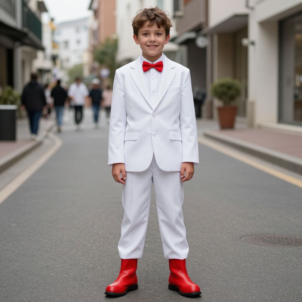 Peep Boy Costume, man in a white suit and red boots on a street