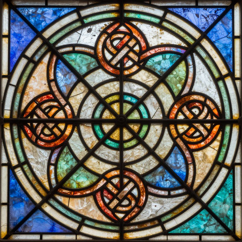 Vibrant stained glass window featuring a circular Celtic knot design with interlocking patterns, vibrant blues, greens, reds, and yellows.