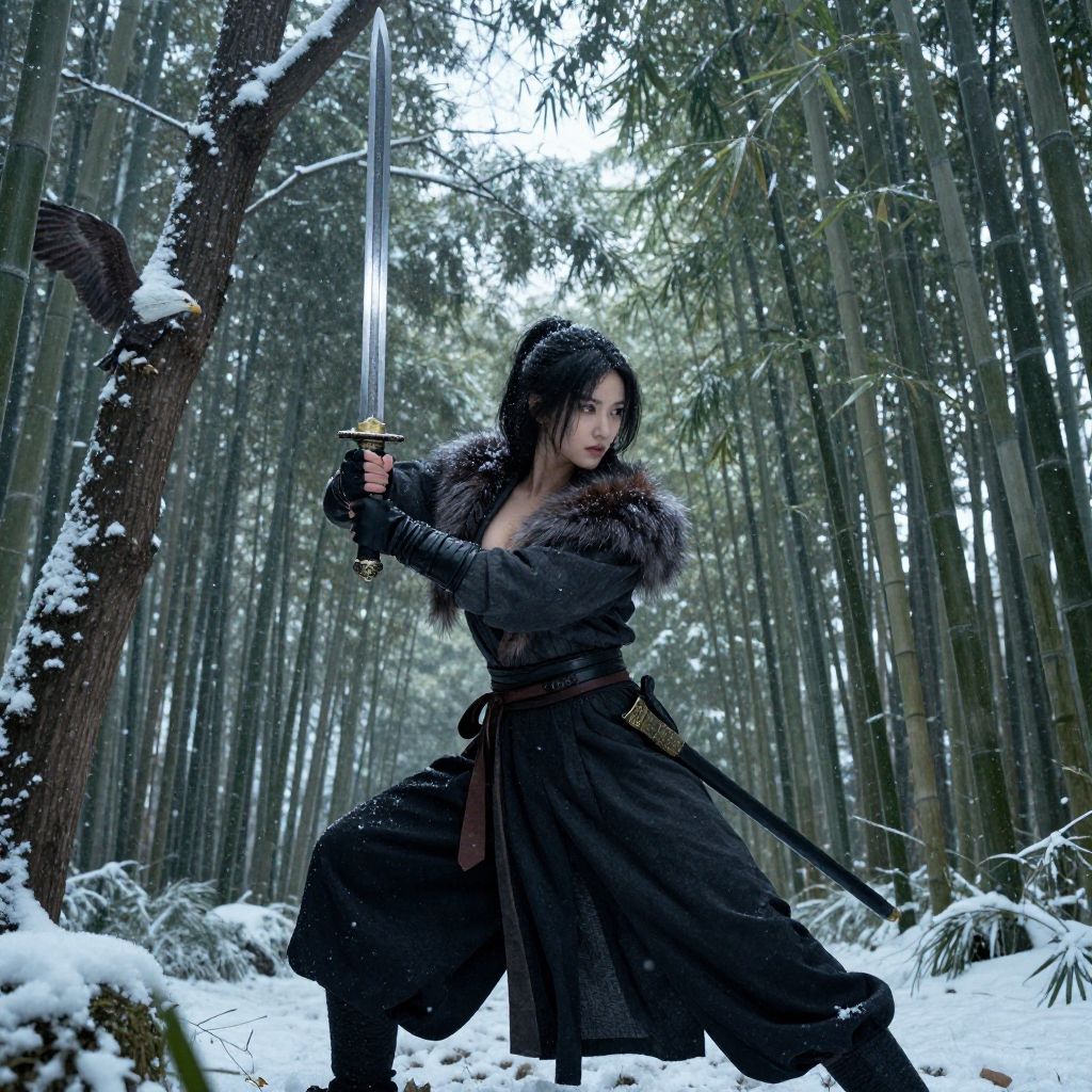 Masterpiece, best quality, swordman, holding a sword(trees:0.5), (eagle:0.5), (bamboo:0.2) fighting stance, Hangzhou, glowing, winter, snowing, solo, weapon, sword, tree, 1girl, holding, gloves, outdoors, sheath, border, holding weapon, black hair, holding sword, fur trim, looking away, medium breast, show cleavage, look at view