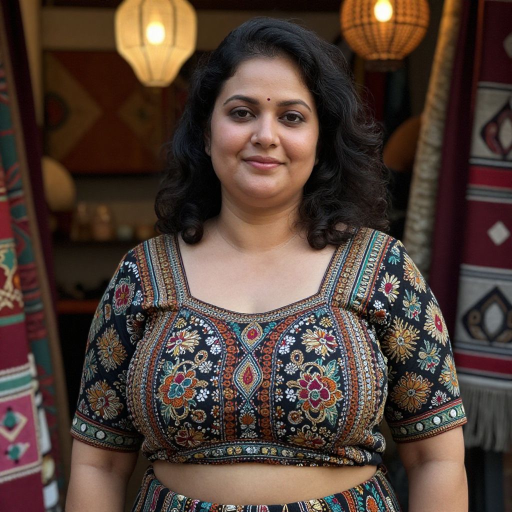 A detailed close-up of a middle-aged woman with a round face, gentle smile, and curly black hair dressed in a full Sambalpuri design costume, including a richly embroidered lungi and a traditional blouse, standing in front of a traditional handloom shop in Odisha, with the soft glow of lanterns and woven textiles visible in the background.. The woman has big breasts and cute face