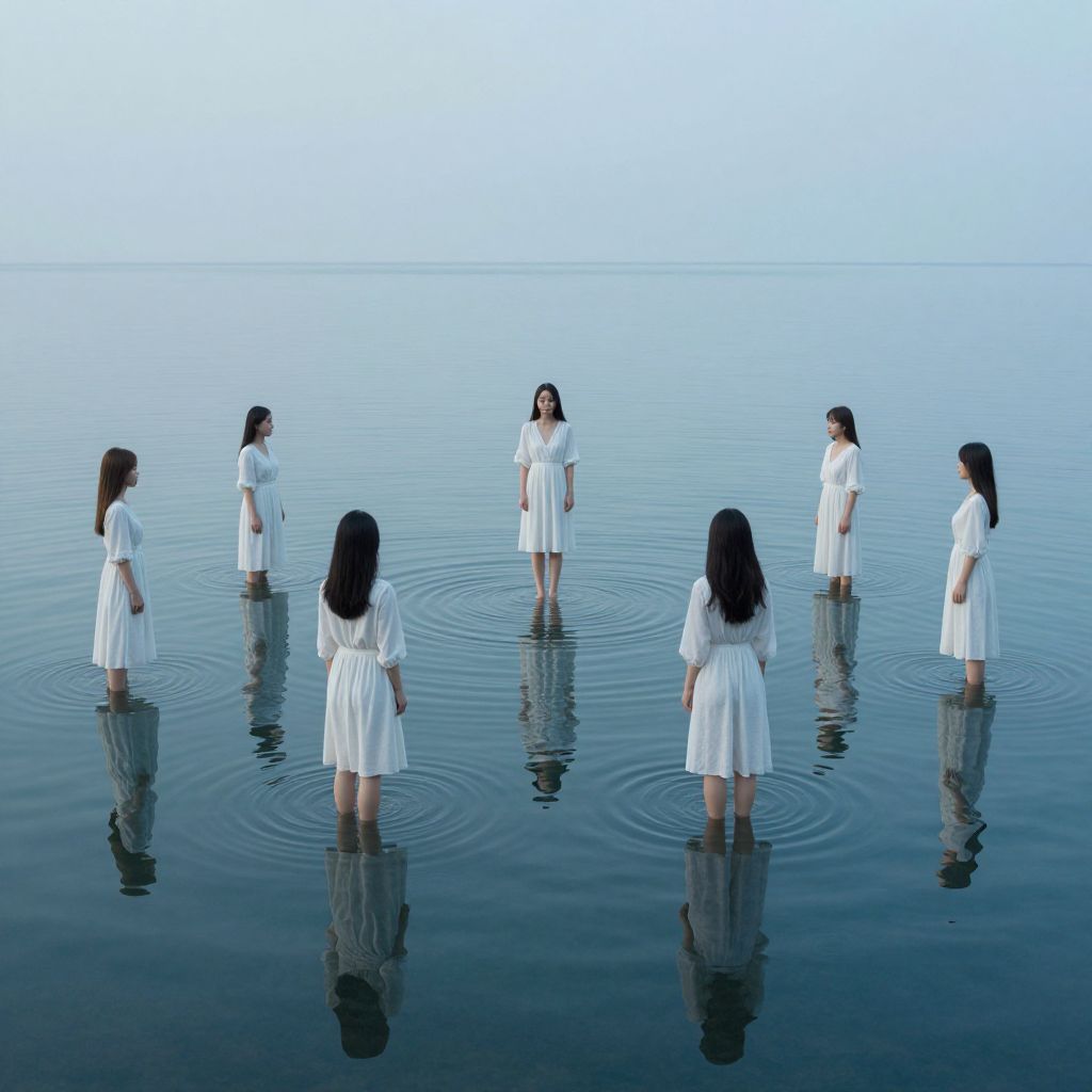 Emerging from a tranquil sea, a woman stands surrounded by ethereal reflections of herself, each figure embodying a parallel path taken in a world where choices ripple outward like concentric circles.