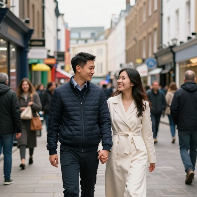 Photograph of an Asian couple walking hand-in-hand down a bustling city street. The man, with short black hair, wears a navy blue puffer jacket over a blue shirt. The woman, with long black hair, wears a white belted coat. Both smile at each other. Background includes blurred pedestrians, shop signs, and colorful storefronts. The street is lined with brick buildings, and the scene is brightly lit with natural daylight. The couple stands out against the busy, urban backdrop.