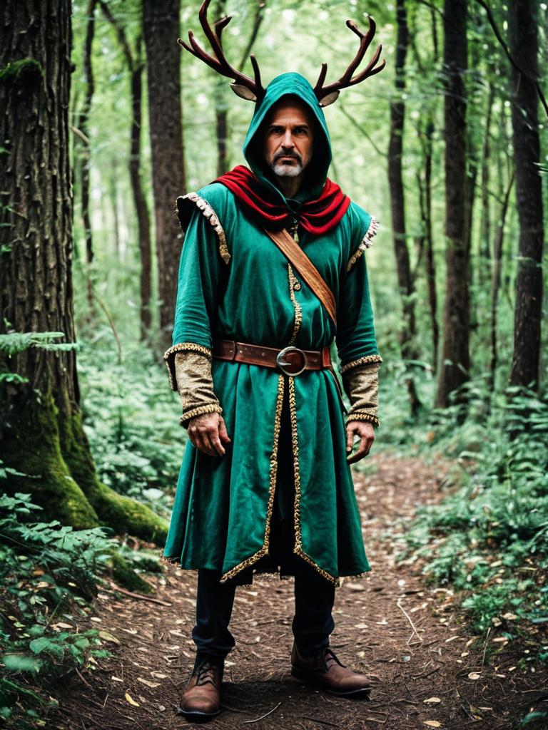 Photorealistic image of a man dressed in a deep green enchanted forest costume standing in a dense forest. The costume features a hood with antlers attached, leaf-like shoulder decorations, leather straps, and buckles. The man has a neatly groomed beard and serious expression, wearing dark pants and boots, embodying a fantasy or cosplay character in a natural woodland setting.