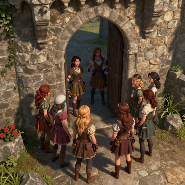 Digital art of six medieval women in brown and green tunics, standing before a stone archway, facing a woman with a sword inside. Sunlit