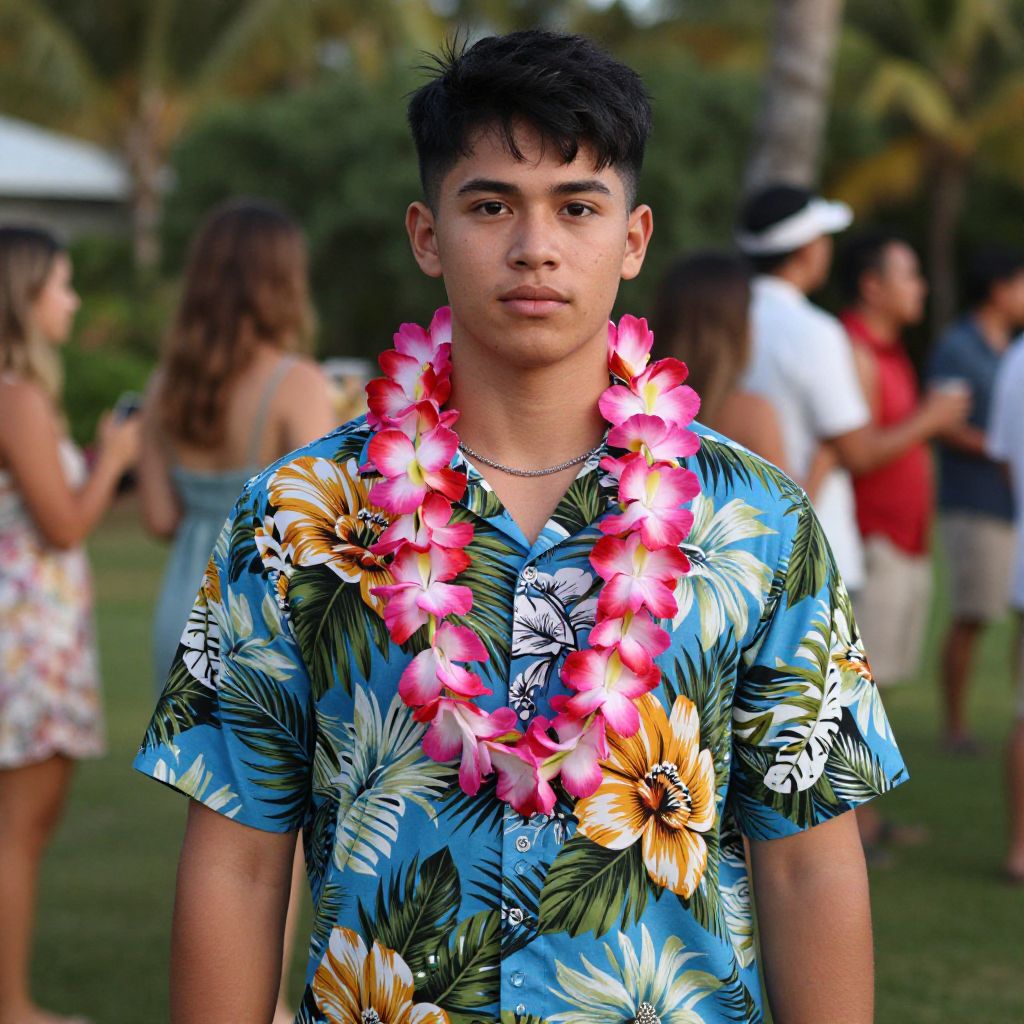Aloha theme party outfit, 1boy, male focus, solo, hawaiian shirt, black hair, floral print, shirt, flower necklace, outdoors