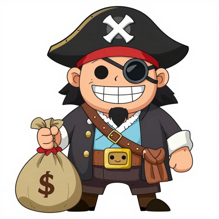 Cartoon pirate with black hat, eyepatch, and "X" symbol, grinning with gold tooth, holding money sack, brown belt,