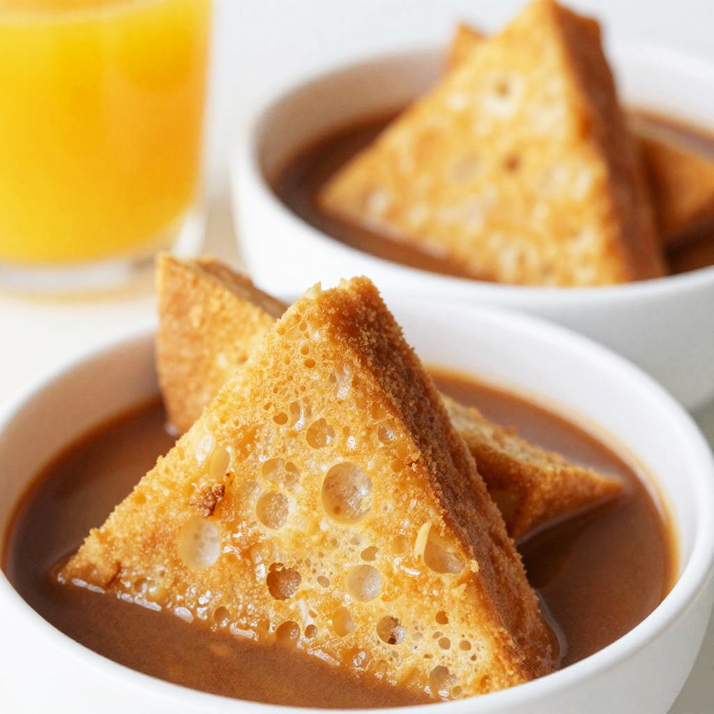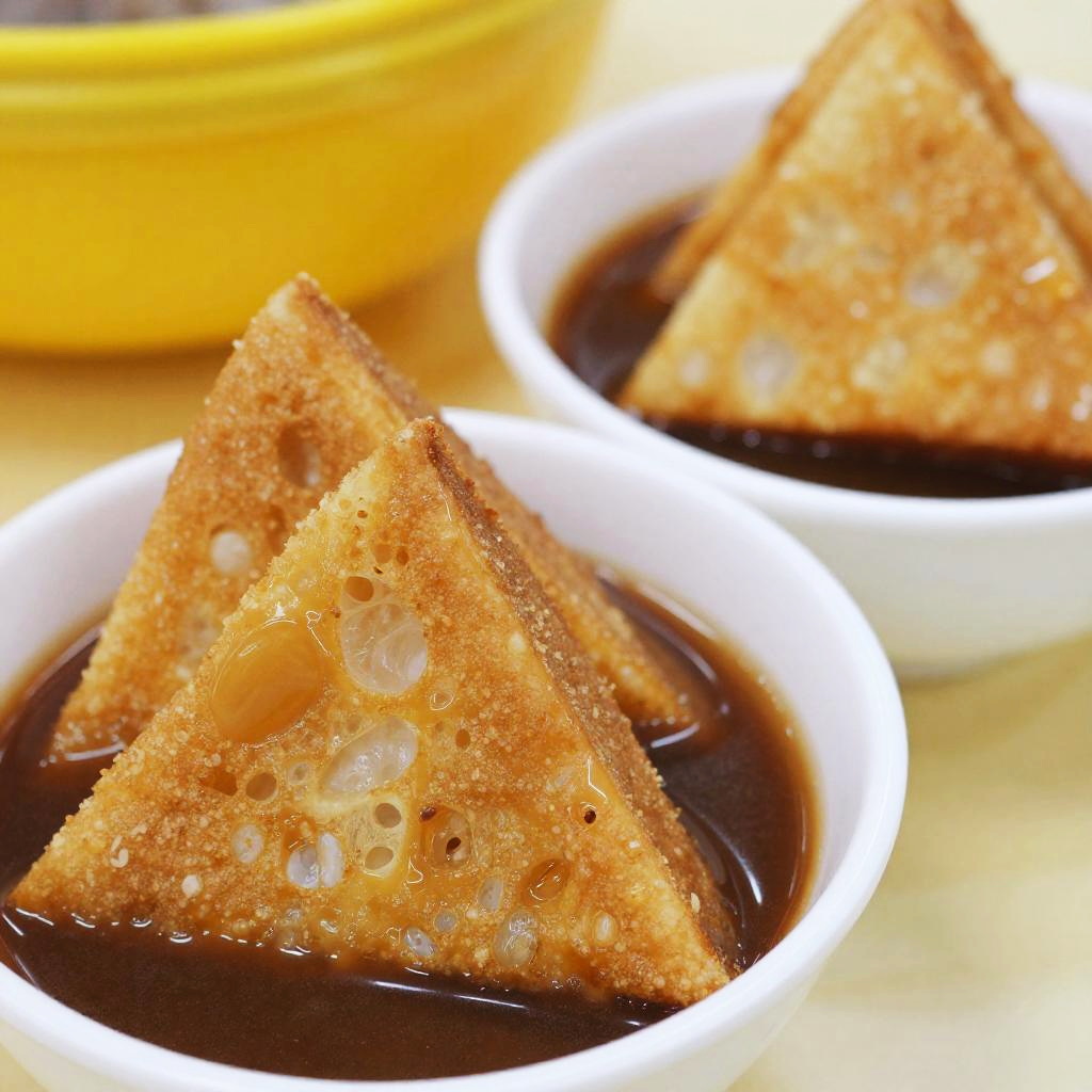 A close-up photo of two white bowls filled with golden-brown, triangular fried bread pieces, each partially submerged in a rich, brown sauce. The bread has a crispy texture with visible air pockets. In the blurred background, there's a yellow object that adds a warm contrast. The image has a bright, vivid color palette, emphasizing the food's texture and color.