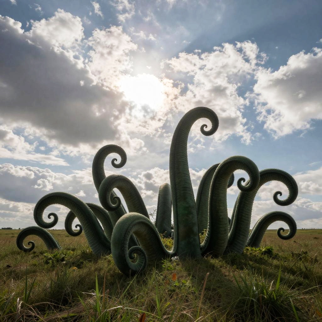 This is a photograph of a surreal landscape featuring large, dark green, tentacle-like shapes twisting and curling over a grassy field. The sky above is partly cloudy with bright sunlight breaking through, casting a soft glow on the scene. The tentacles have a smooth, almost velvety texture, and their shapes create an otherworldly, dreamlike atmosphere.