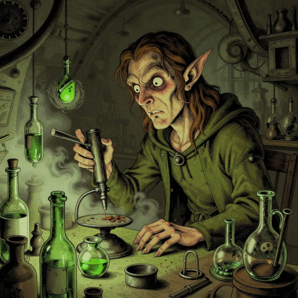 Illustration of a mad elf scientist working intensely in a medieval gothic laboratory filled with green glass bottles, mist, and alchemical equipment. The elf has long red hair, pointed ears, and wears a green hooded robe. The scene is detailed with intricate line art, glowing green liquids, and an eerie atmosphere created by dust and mist.