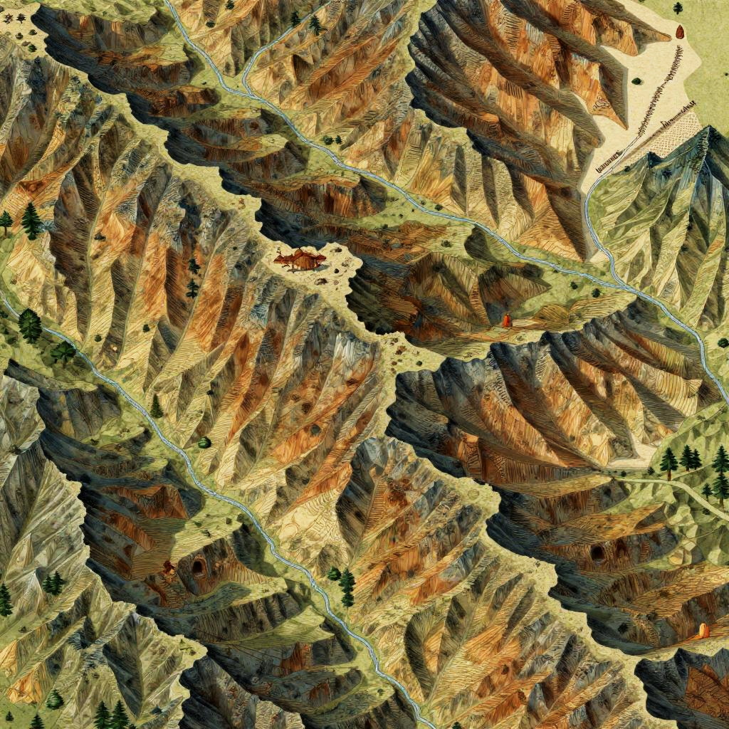 Map art generator designing an ancient mountain range map with exaggerated elevations, rugged topography, hand-painted texture showing different climate zones, vintage explorer theme, rich earth tones, intricate details highlighting valleys, rivers, and hidden caves in a painterly style.