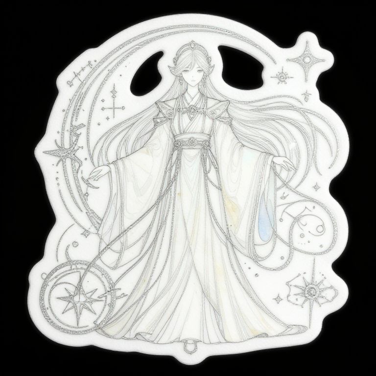 Albedo sticker illustration emphasizing a mystical theme with a delicate character in flowing robes, intricate linework, and subtle watercolor textures, complemented by celestial motifs and a shimmering silver outline for an enchanting aesthetic.