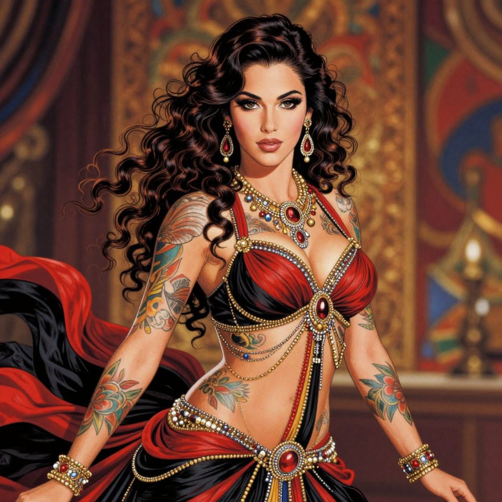 The image depicts a beautifully rendered, highly detailed artwork of a glamorous Turkish woman in an anime-style. Her body is adorned with intricate tattoos and a vibrant, flowing outfit that combines red and black hues, accented with gold and silver jewelry. The woman's hair is styled in loose, wavy curls, cascading down her shoulders. The background is a blur of rich, warm colors and abstract shapes, suggesting an ornate, opulent setting. The overall composition is dynamic, with the woman positioned centrally, her gaze directed forward, exuding confidence and elegance. The artwork appears to be a collaboration between David LaChapelle, Alexandre Cabanel, and Roberto Ferri, blending elements of traditional and modern art styles.