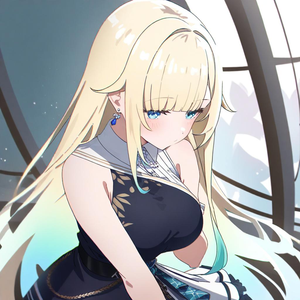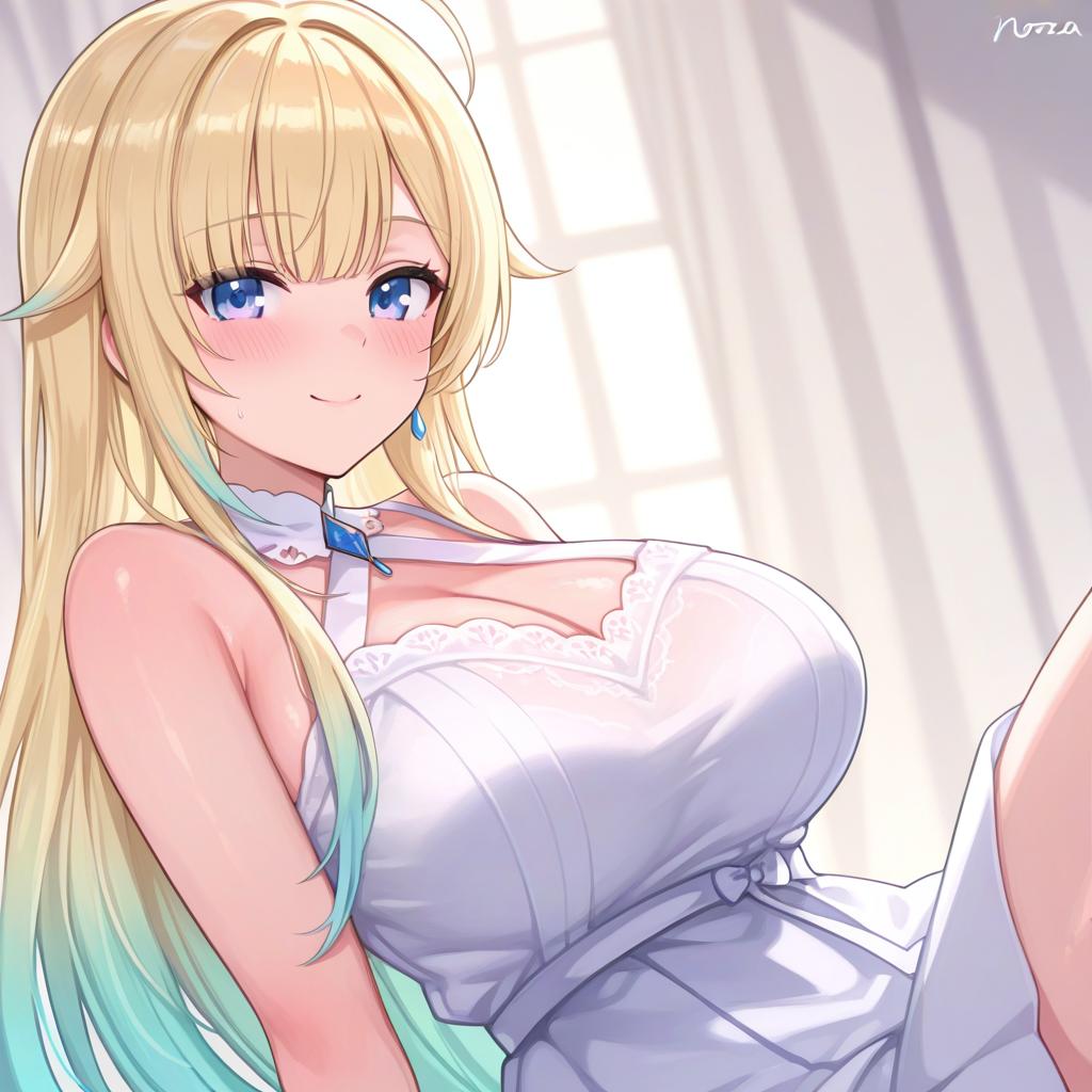 Alice zuberg, sword art online, 1girl, floating hair, blue eyes, blonde hair, very long hair, white hairband, hair intakes, sidelocks, braided ponytail, medium breasts, by artist tonee, illustrious