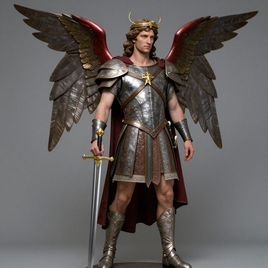 Music Video creates a super detailed ultra-realistic human St. Michael the Archangel, his sword is visible,