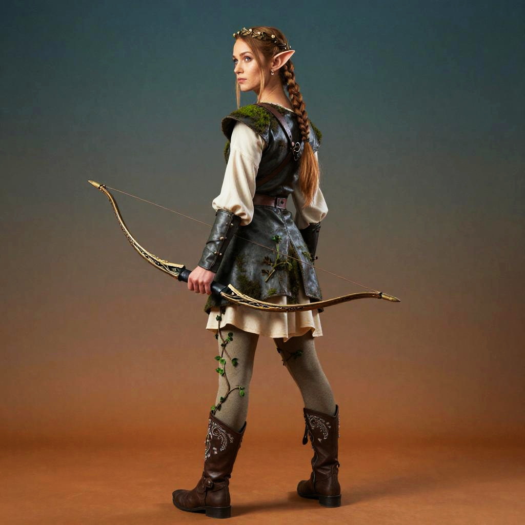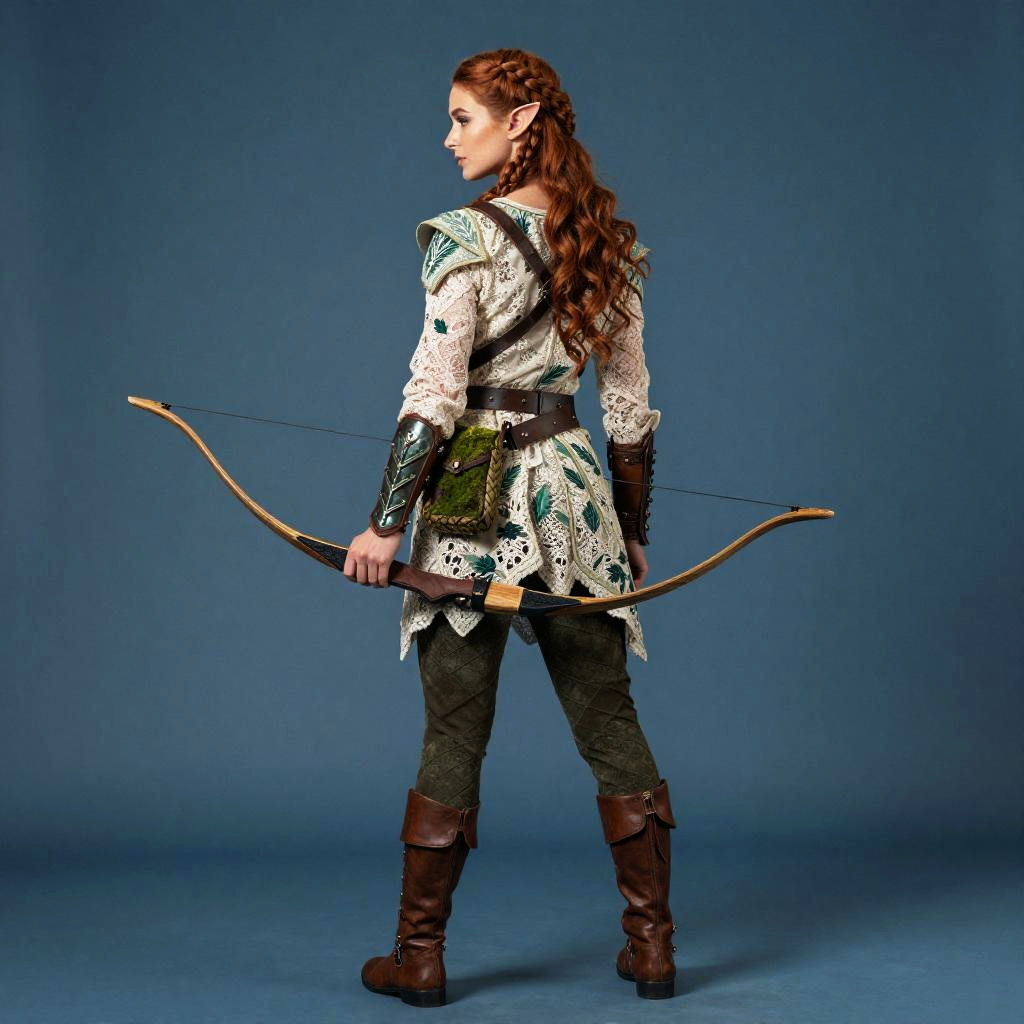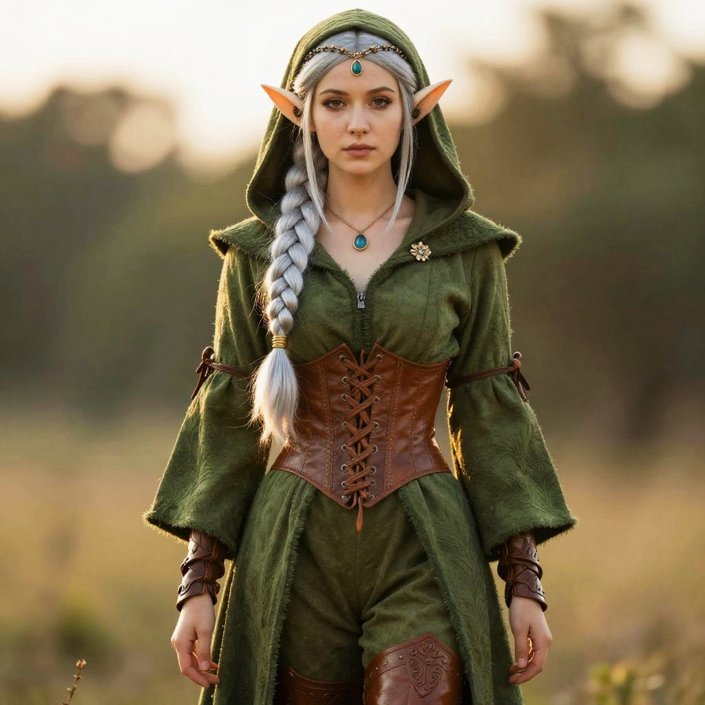 Photo. Willowy elf, Silver waist-length braid with small beads, elf outfit, Moonlit cloak embroidered with constellations and silver thigh-high boots, bokeh night portrait