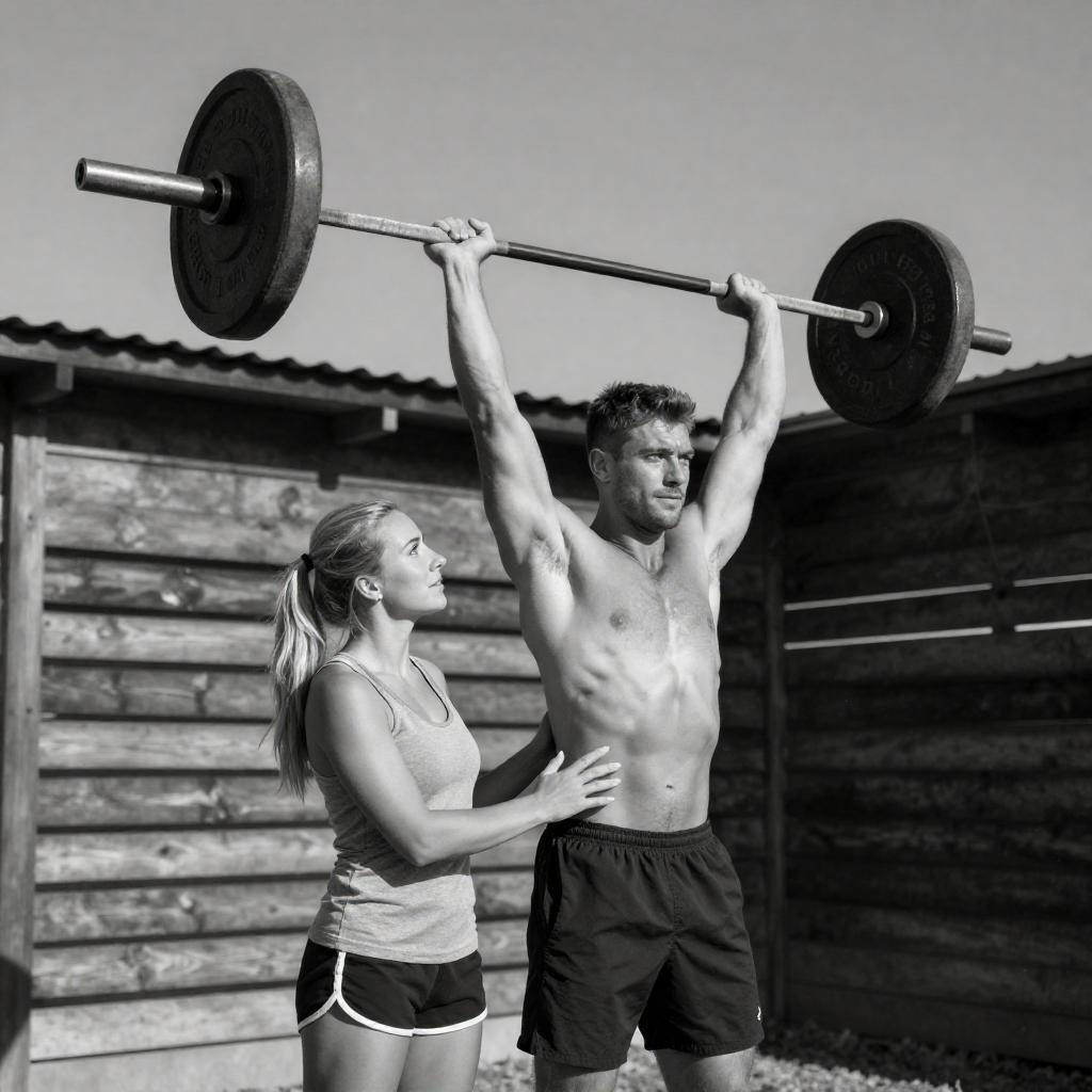Black-and-white photograph of a muscular, shirtless man with short hair lifting a barbell overhead, standing beside a blonde woman in a tank top and shorts. She touches his waist, looking up at him. They are in a rustic, wooden structure with slatted walls and a clear sky above.