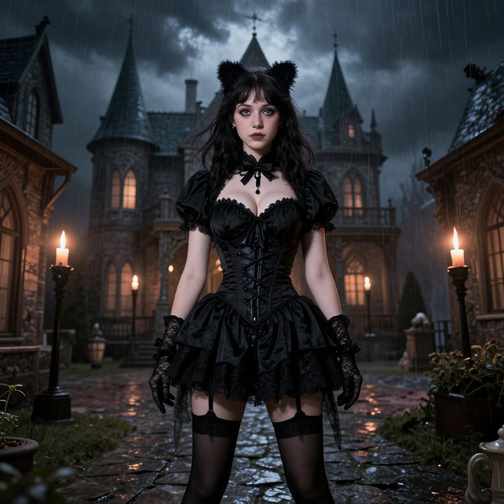 A young woman with fair skin and freckles, wearing a theatrical black costume outfit with a corseted bodice, black tights, and lace gloves, stands in a haunted mansion courtyard during a stormy evening, with flickering candles and heavy storm clouds overhead, her face illuminated by torchlight casting dramatic shadows. The woman has big tits and cute face