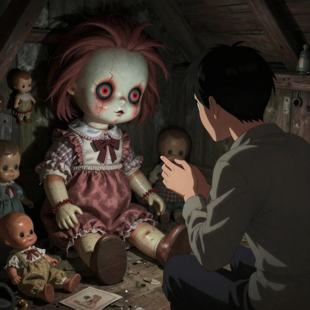 Digital illustration of a man facing a creepy, stitched doll with pink hair, red eyes, and tattered clothes in a dim attic, surrounded by other