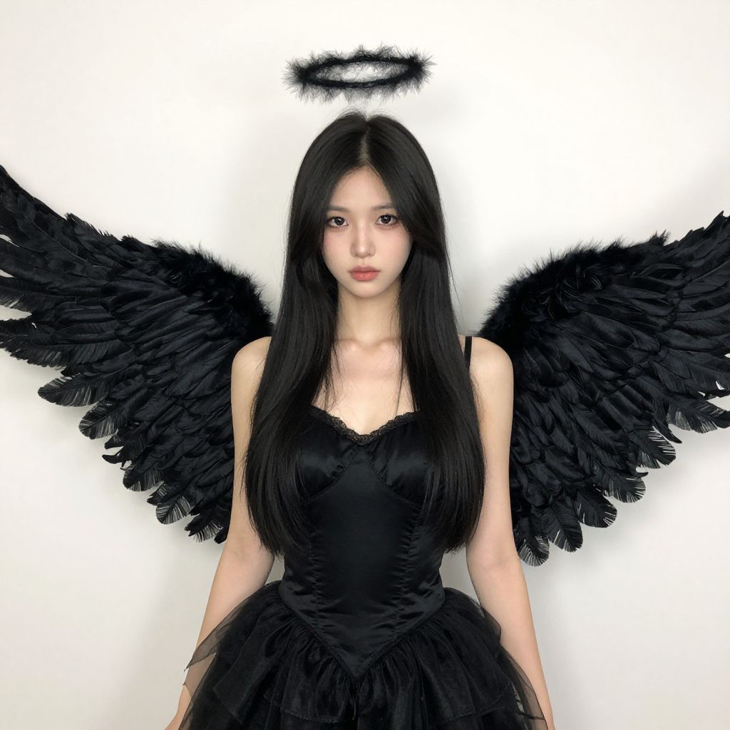 Digital artwork of an East Asian angel with long black hair, black dress, and large black feather wings, halo above head, white background.
