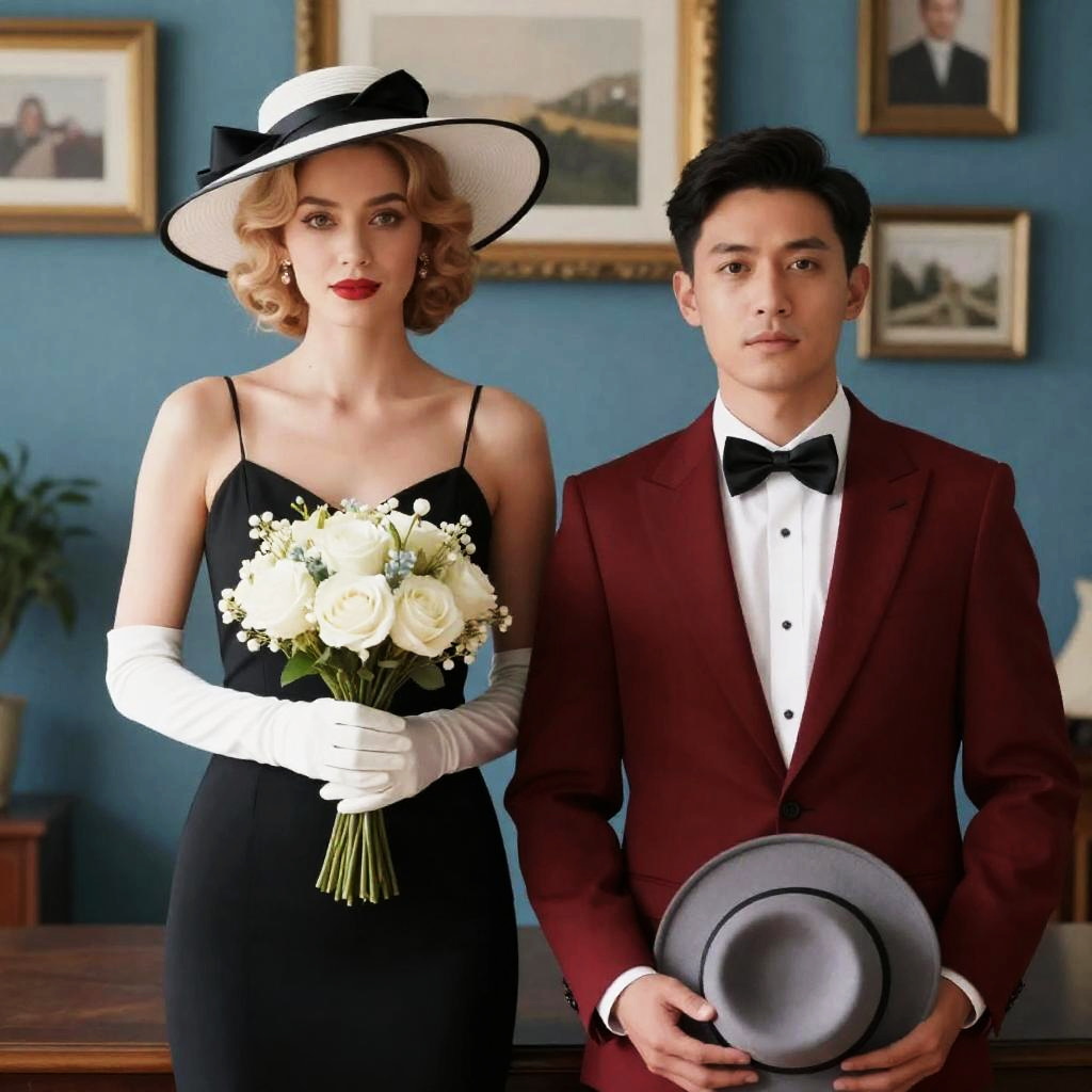 Photograph of a woman and a man in formal attire. Woman with blonde curls, black dress, white gloves, and black and white hat, holding bouquet. Man in red suit, black bow tie, and white shirt, holding grey hat. Blue wall, framed pictures, and plant in background. Woman standing, man sitting. Both have neutral expressions.