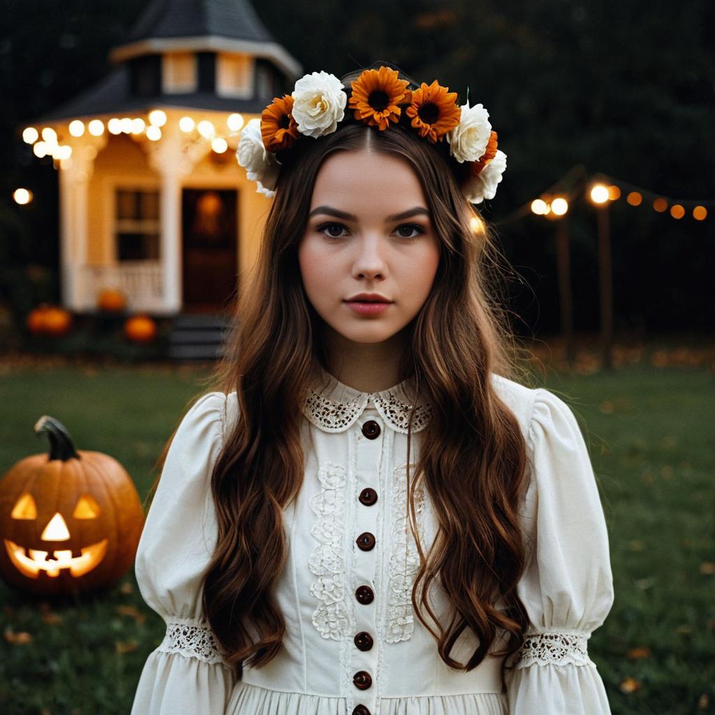 Pearl mia goth halloween, photograph of young girl, Victorian-style dress, long wavy brown hair, flower crown, white blouse with brown buttons and lace, standing outdoors, blurry background with warm lights, carved pumpkin with lit face, evening setting, realistic, soft light, front view, slight melancholy expression, autumn atmosphere, bokeh effect in background, realistic ures