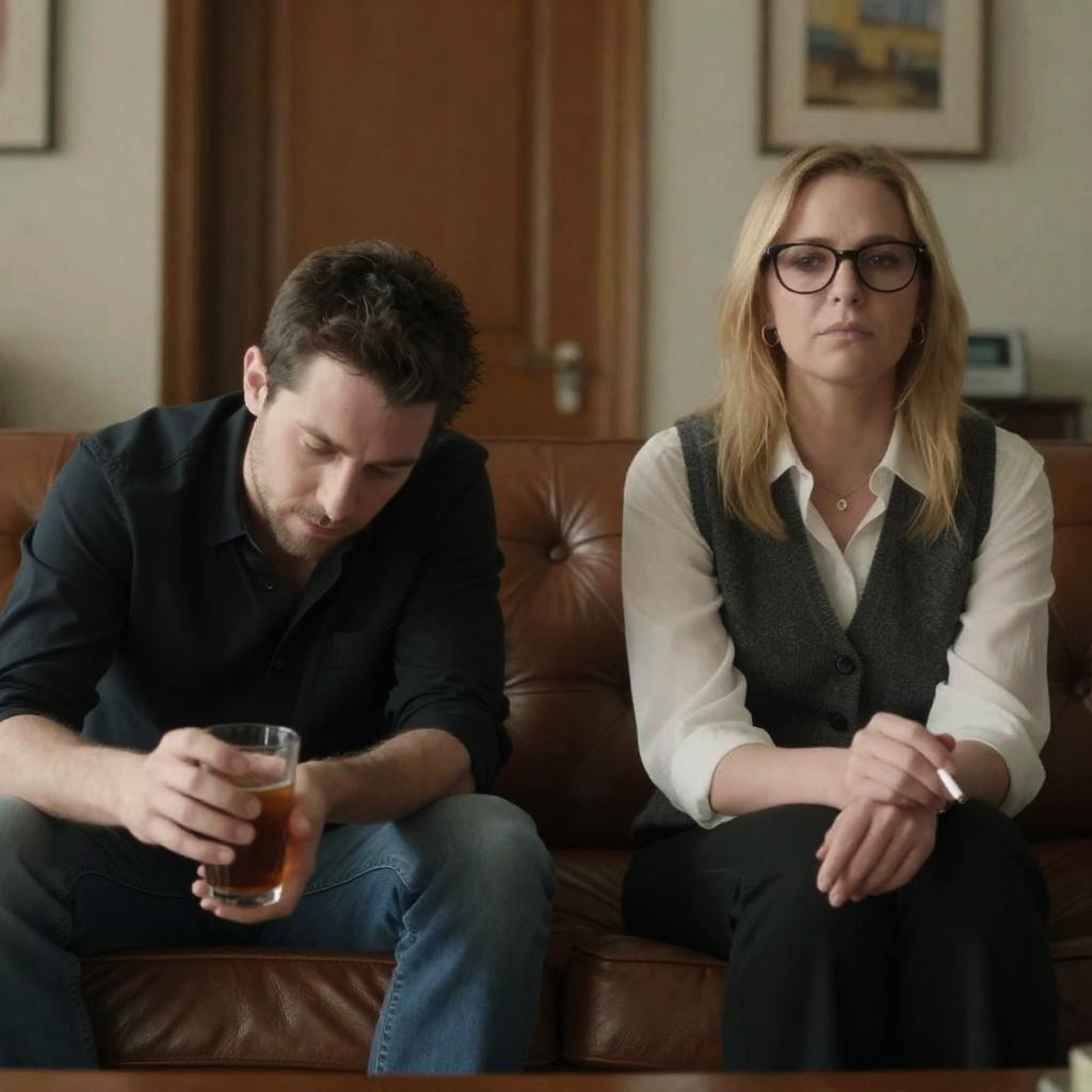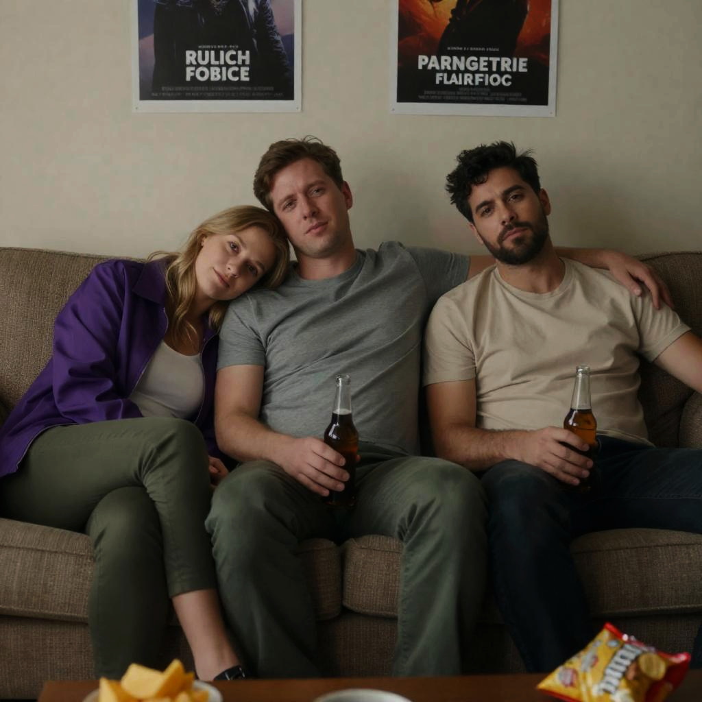 Three people on a couch, dimly lit. Blonde woman in purple jacket, green pants, sitting left, leaning on middle man. Middle man, brown hair, grey t-shirt, green pants, holding beer. Right man, dark hair, beige shirt, dark pants, arm on backrest, holding beer. Snack bag on right. Two posters on wall. Casual setting.