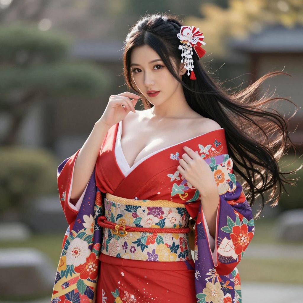 A stunning Asian woman with big tits and a sexy allure, wearing a beautifully detailed red and purple kimono with intricate floral patterns, her long flowing hair adorned with traditional Japanese accessories on her head, standing in a serene garden under soft sunlight, elegant posture, high-resolution, cinematic lighting, vibrant colors, fantasy style, ultra-detailed, 8K