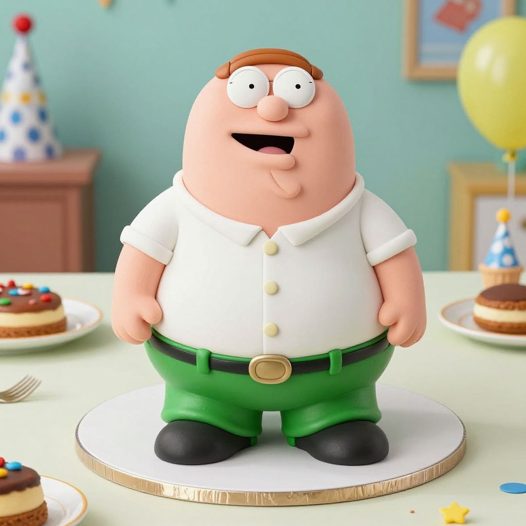 Peter Griffin cake, multi-tiered cake with edible images and 3D fondant figures of Peter Griffin in various poses, surrounded by comic style accents, photorealistic and festive