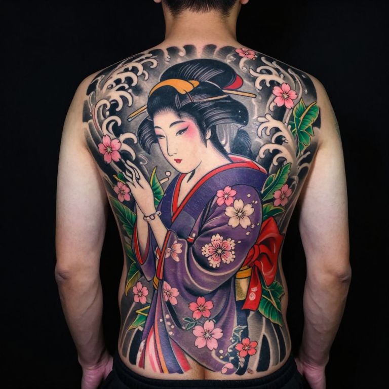 Photograph of a man's back with elaborate Japanese-style tattoo of a red-haired geisha in traditional kimono, surrounded by flowers and clouds, in