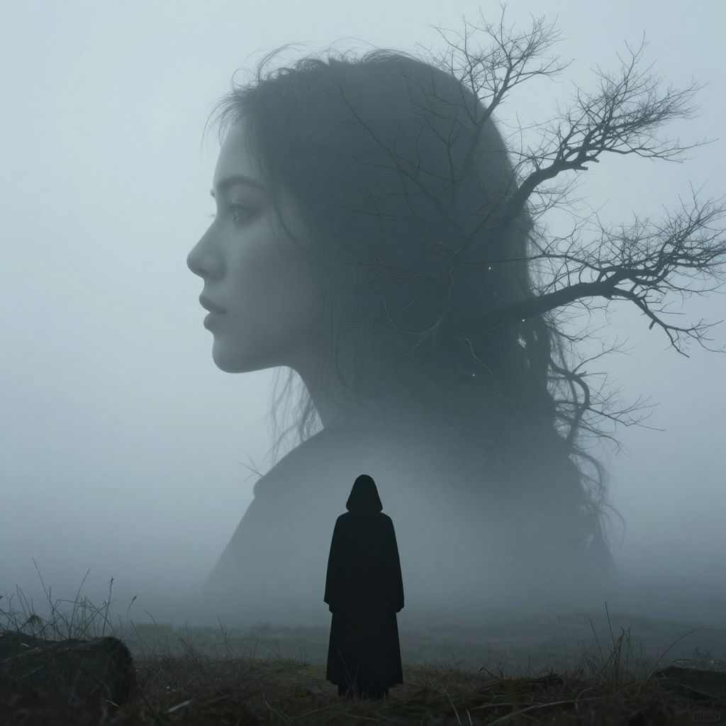 Mist-shrouded landscape reveals a haunting silhouette of a woman's profile, her hair merging seamlessly with gnarled tree branches, as a cloaked figure stands solemnly in the foreground, gazing toward the ethereal scene.