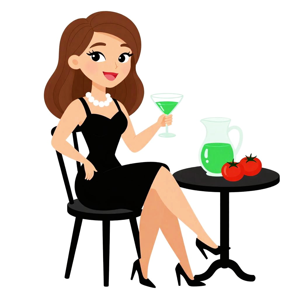This is a colorful digital cartoon drawing of a smiling woman with light skin and brown hair, wearing a black dress and pearl necklace. She's sitting on a black chair, holding a green cocktail glass, with a matching green pitcher and two red tomatoes on a small round table to her right. She's wearing black high heels and has a relaxed, confident vibe. The background is plain white.