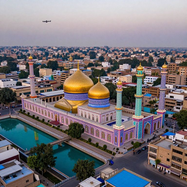 Prompt Pakistan: A vibrant, modern cityscape of Islamabad with golden mosques, turquoise rivers, and traditional folk art painted on buildings, illuminated at dusk with soft neon hues and drone photography style.