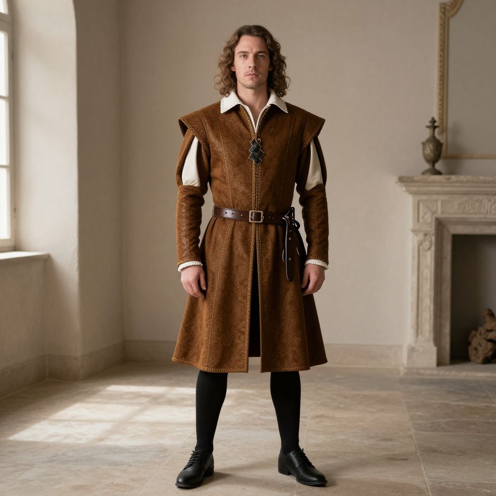 Photograph of a Caucasian man with long, curly brown hair standing in a sunlit, elegant room. He wears a brown, medieval-style, knee-length tunic with a white shirt underneath, black leggings, and black shoes. The tunic has puffed shoulders and a belt with a buckle. He stands confidently with his hands by his sides. The background features a white-walled room with a large window on the left, casting natural light, and an ornate, white fireplace on the right. A small, decorative vase sits on the fireplace mantel. The floor is made of light-colored stone tiles.