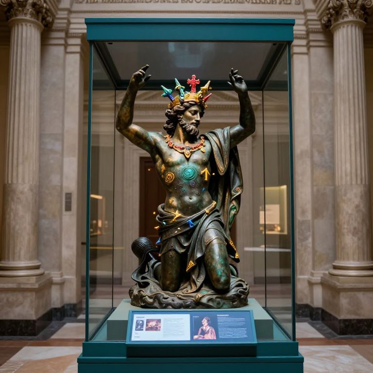 The image showcases a striking sculpture of Orpheus, a deified individual covered in magical spells, housed within a glass case. The statue, crafted from a dark, possibly bronze material, is adorned with vibrant, multicolored elements that resemble a crown or headdress, adding a sense of mysticism and enchantment. The figure is depicted in a dynamic pose, kneeling with arms raised, exuding a sense of power and reverence. Below the sculpture, a teal-colored pedestal holds a digital multimedia interface screen displaying various images and text, possibly providing information about the artwork or related historical context. The surrounding architecture, characterized by grand columns and intricate detailing, frames the sculpture, enhancing its prominence. The interplay of the physical sculpture with the digital interface creates a juxtaposition of traditional art and modern technology, reflecting the complex relationship between the past and the present. The overall composition is balanced, with the sculpture centrally positioned and the digital screen serving as a complementary element, together creating a thought-provoking display.