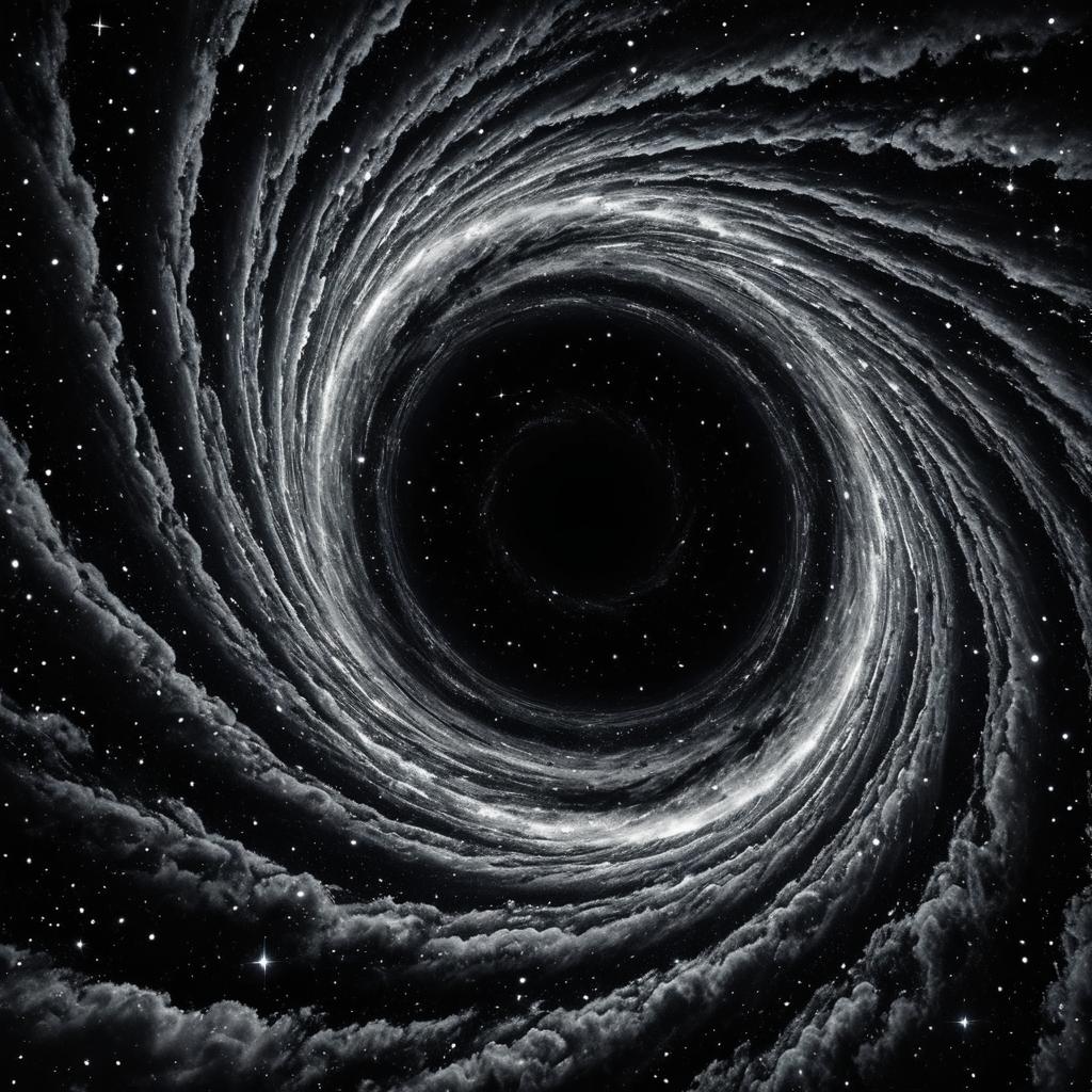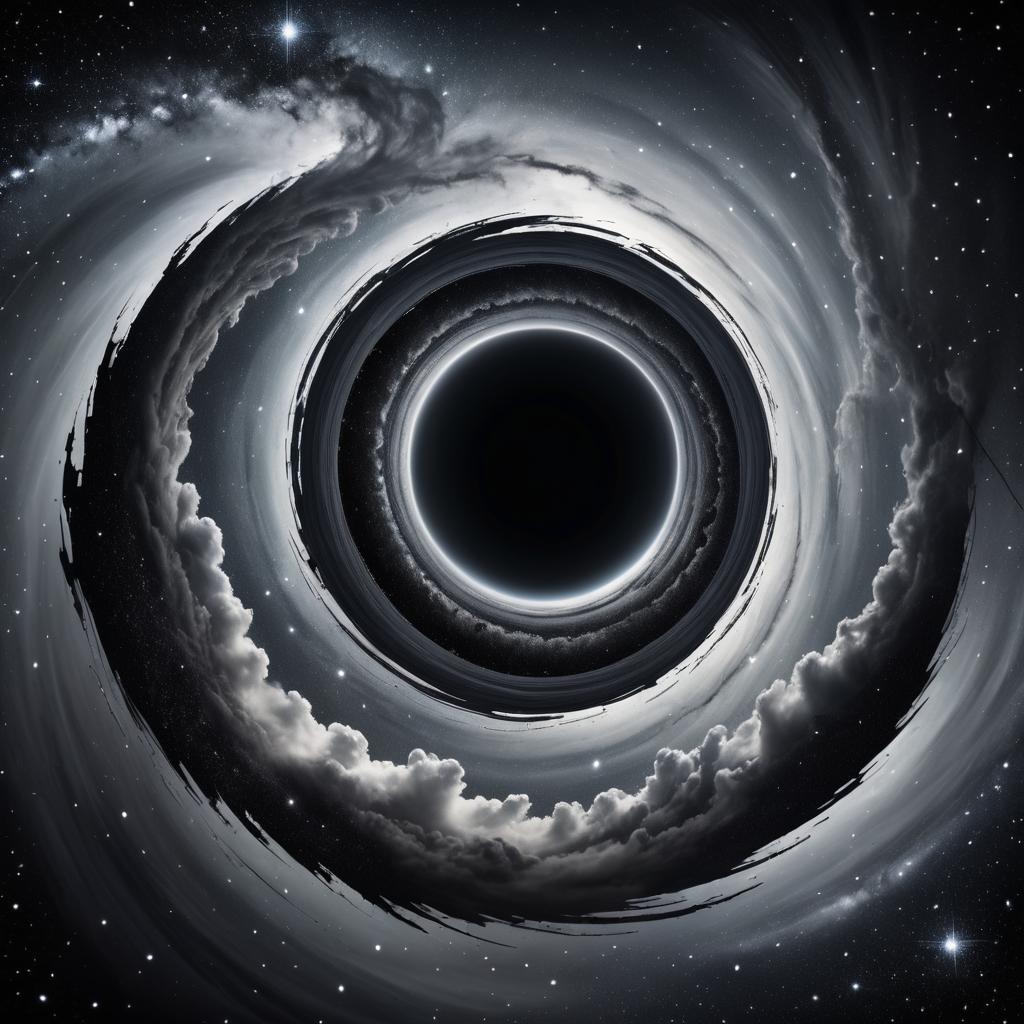 A dark surreal cosmic scene depicting a swirling black hole vortex in space, surrounded by textured grey and black clouds and distant stars, ethereal and mysterious atmosphere, abstract space environment, high contrast lighting