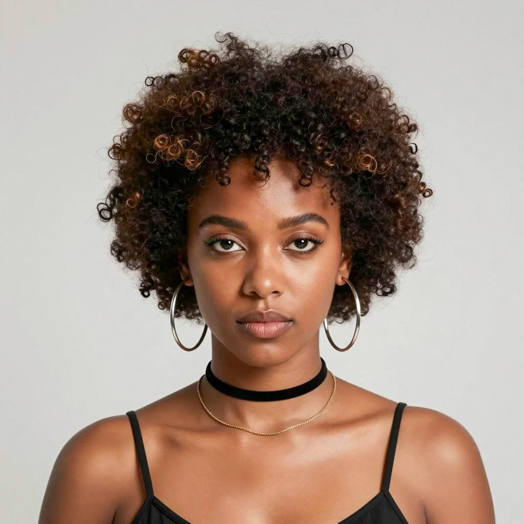 Photograph of a dark-skinned woman with curly hair, wearing orange and pink halter top, large circular earrings with colorful tassels, orange choker. Bright pink background. Intense gaze, bold makeup with yellow-orange eyeshadow. Upper body, frontal view.