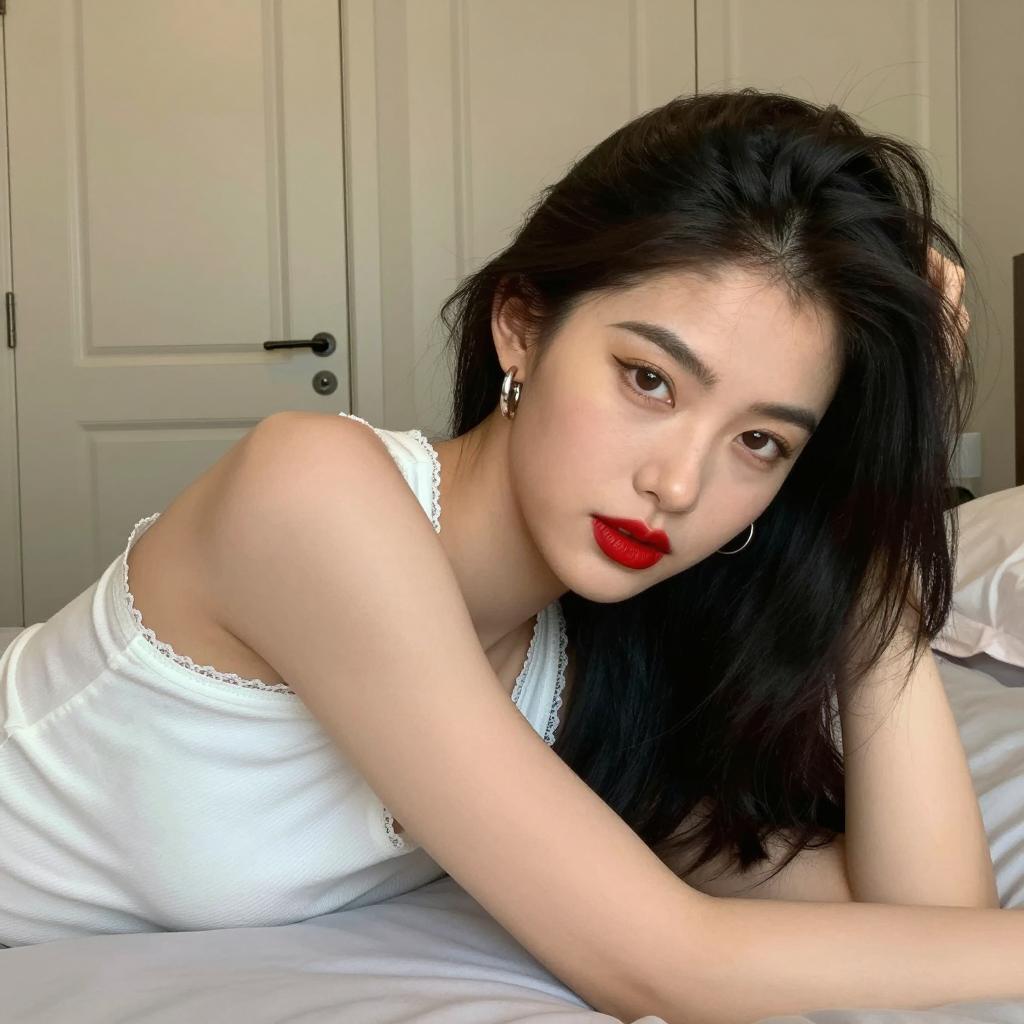 Photograph of a woman with long, wavy black hair covering her face with her right hand. She wears a black top, silver necklace with a floral pendant, and dangling earrings. Her lips are slightly parted. Background has white curtains and a window. Her skin tone is light. Her hand is positioned in the center, partially obscuring her face.